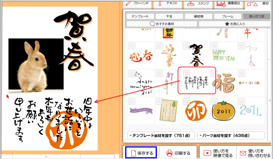 次に、たくさんある素材の中から、挨拶文をドラッグアンドドロップして追加します。