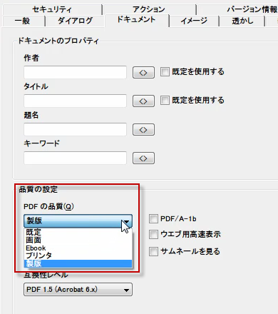 ドキュメントタブでは、プロパティや、PDFの品質が設定できます。