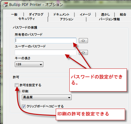 セキュリティタブでは、パスワードを設定することで、PDFファイルを保護することができます。