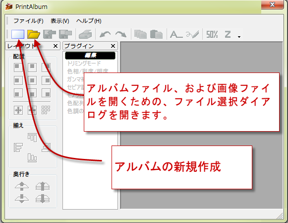 起動画面です。最初の状態ではアルバムの新規作成と、フォルダを開くボタンが表示されています。