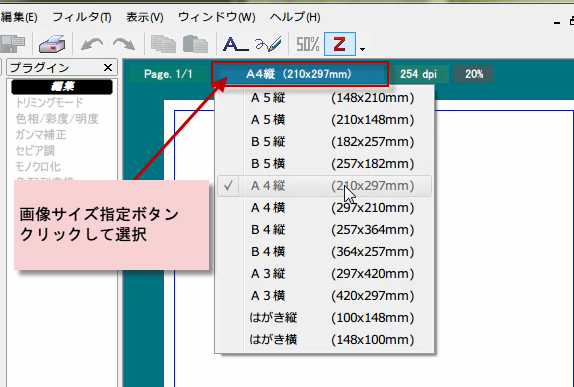 アルバムの新規作成ボタンをクックして、用紙を表示したら、画像サイズ指定ボタンで、用紙のサイズを指定します。