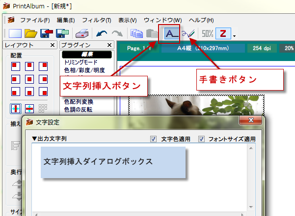 文字を挿入するには、文字列挿入ボタンを押します。