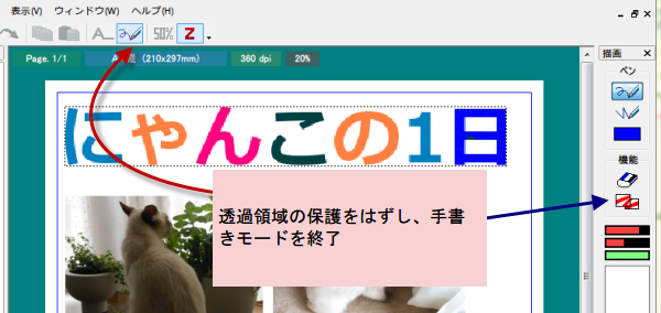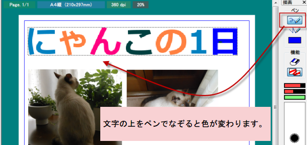 入力した文字列が選択サれている状態で、文字の上のペンでなぞると、選択した色で文字を塗りつぶすことができます。