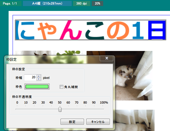 枠設定をクリックして、文字に枠色を追加します。枠幅と枠色、枠の不透明度を設定して、設定ボタンを押します。