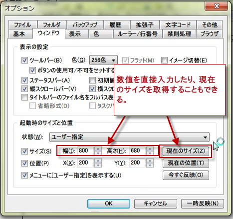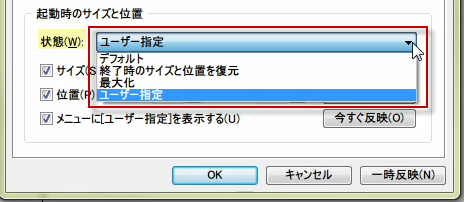 起動時のサイズには、デフォルト、終了時のサイズと位置を復元、最大化、ユーザー指定の4種類があります。