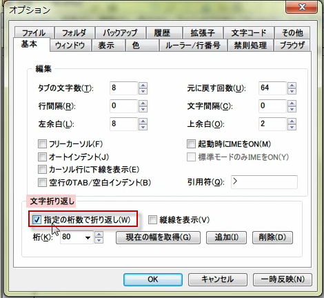 オプションの基本タブから文字折り返し設定にチェックをいれましょう。