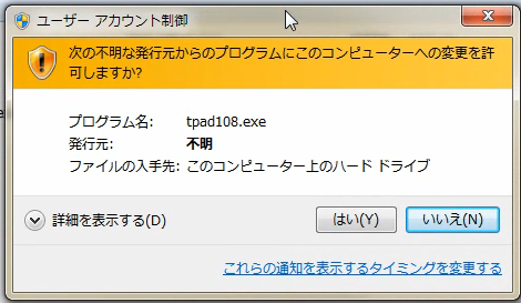 ユーザーの意図しない操作や許可していないプログラムなど、実行を防ぐための事前に確認をする、セキュリティ メッセージウィンドです。