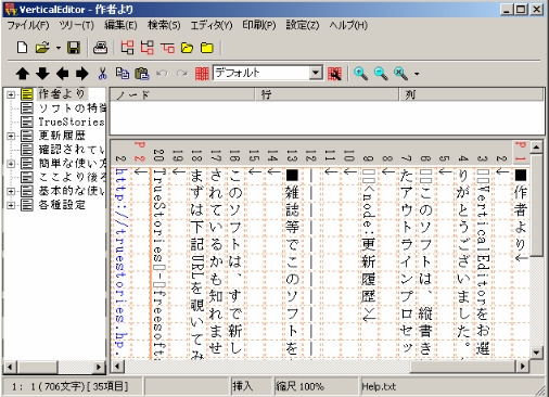 3.エディタ部では、縦書き・ふりがな表示に対応。縦書き表示が標準設定になって